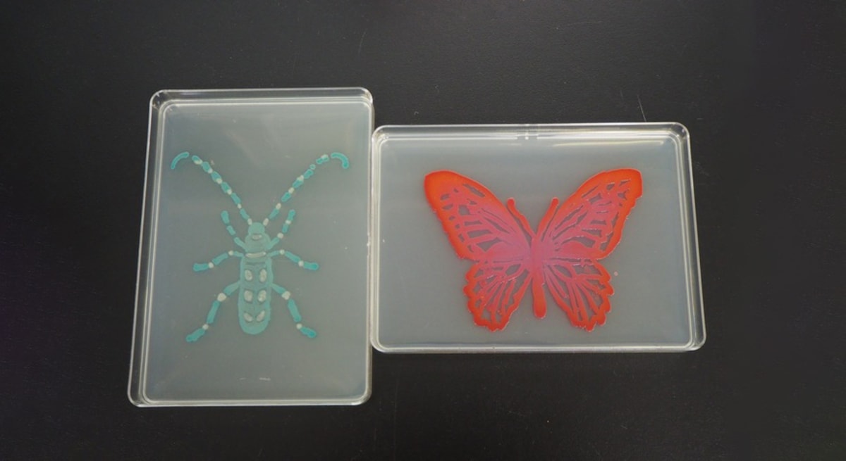 「大腸菌の青白コロニーでカミキリ虫を、Serratiaで蝶を描きました」